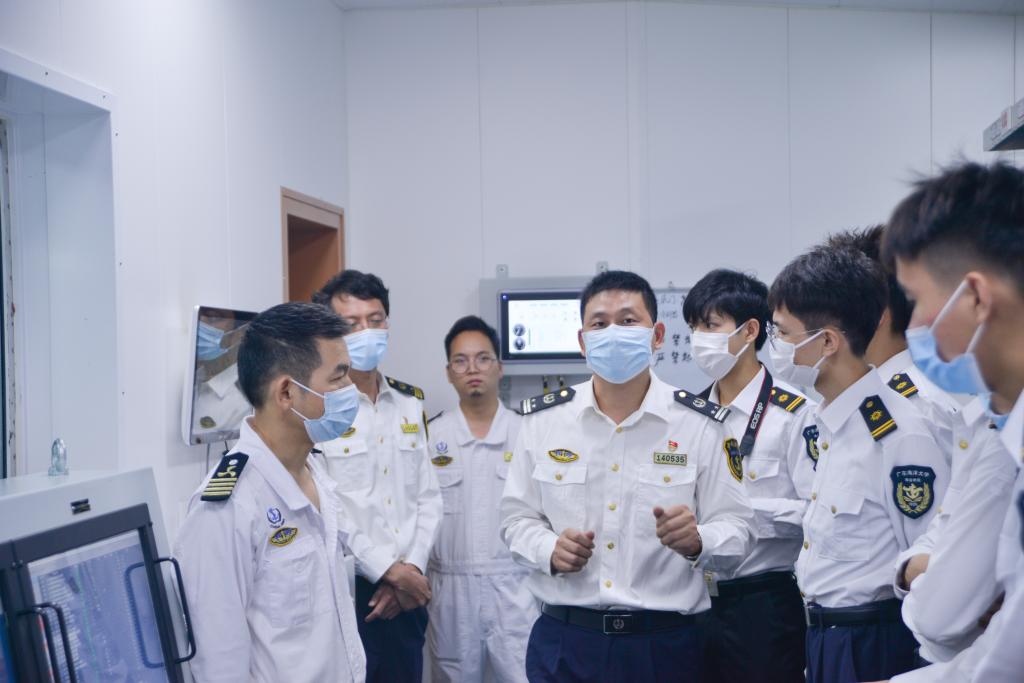 在杨鹍鹏等的带领下,员工有序参观了“深海01”轮的指挥塔台、轮机舱室、执法人员生活区等,观看了深圳海事局宣传视频,了解航海仪器仪表的配备和功能、船舶主机和发电机的功能参数、集控室仪表船舶相关技术参数等,国内首个锂电池动力船舶机舱、全自动化船舶综合电力系统给同学们留下了深刻印象。参观过程中,深圳海事局领导对于同学们的提问给予耐心细致回答,同学们兴趣高昂,纷纷表示获益匪浅,不仅近距离参观了船舶仪器设备,学习了相关专业知识,了解了海上执法人员的工作和生活情况,更激发了投身海洋强国建设的决心。