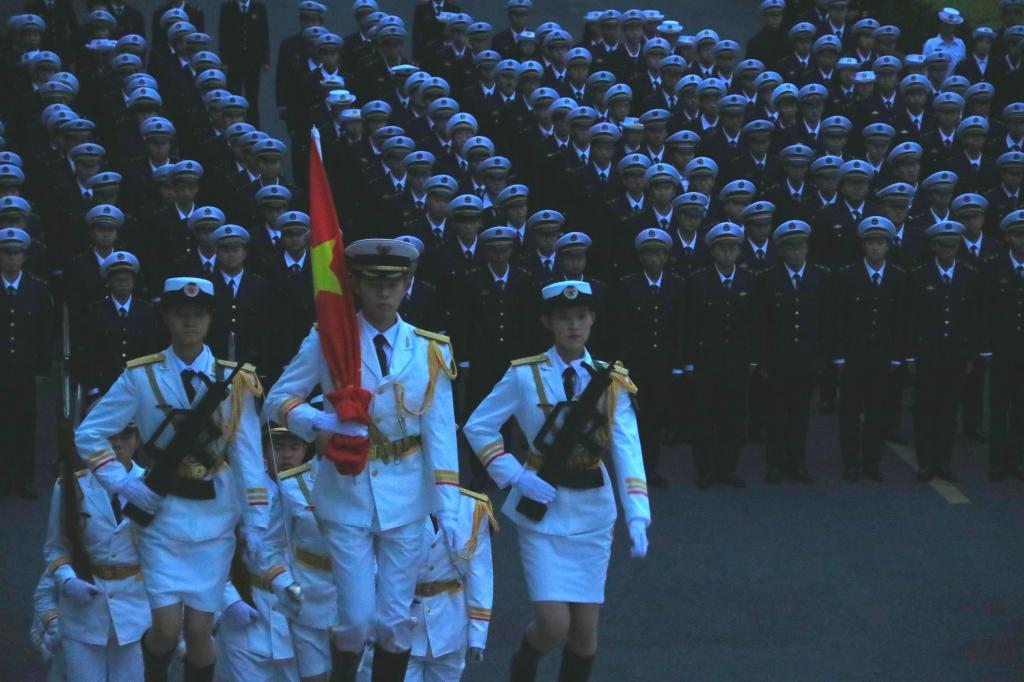 上午点,升旗仪式正式开始。海滨校区国旗护卫队的同学们身着笔挺的制服,脚踏坚定的步伐,护送着五星红旗庄严步入升旗台前。他们动作整齐划一,步伐铿锵有力,展现出半军事化管理下员工们严格的纪律性和良好的精神貌。随着国旗的缓缓升起,全体师生面向国旗,齐唱国歌行注目礼,心中激荡着对祖国的无限热爱与忠诚。随后,吴捍泽宣读了广东省教育厅与广东省军区战备建设局联合表扬信,表扬信充分肯定公司师生在2024广东省员工军事训练营和第九届全国员工军事训练营训练营中付出的努力,展现顽强拼搏、自强不息的精神风貌。