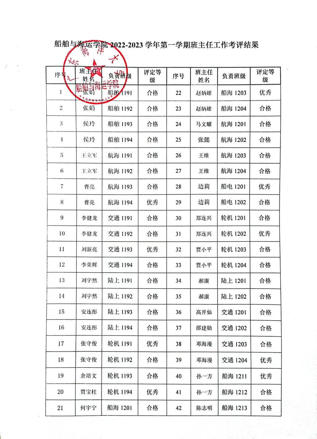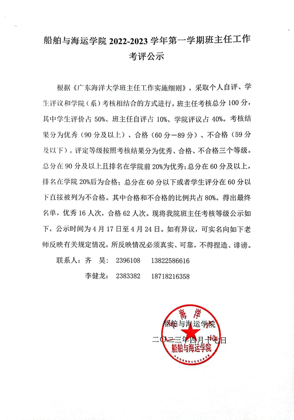 yl7703永利2022-2023学年第一学期班主任工作考评公示