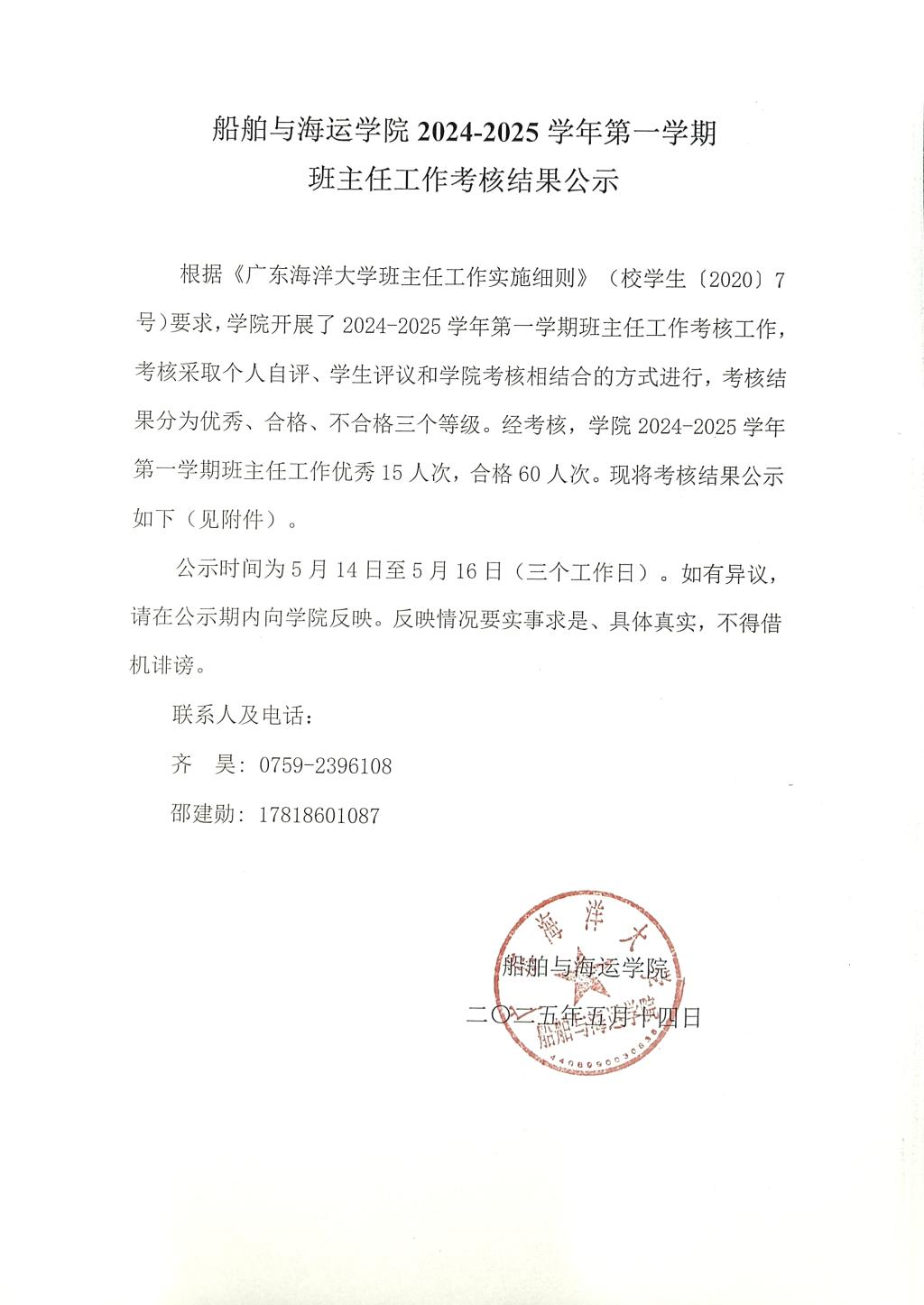 根据《yl7703永利班主任工作实施细则》(校员工〔2020〕7号)要求,公司开展了2024-2025学年第一学期班主任工作考核工作,考核采取个人自评、员工评议和公司考核相结合的方式进行,考核结果分为优秀、合格、不合格三个等级。经考核,公司2024-2025学年第一学期班主任工作优秀15人次,合格60人次。现将考核结果公示如下(见附件)。
