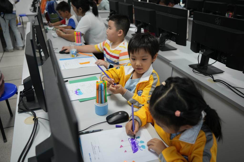 在船舶VR综合训练模拟室,孩子们更是亲身体验了一把当“小小航海家”的乐趣。他们拿起画笔和纸,描绘出自己梦想中的巨轮。在蓝色的画布上,一艘艘雄伟壮观或灵动优雅的巨轮逐渐成型,承载着孩子们对未来探索的无限想象和憧憬。