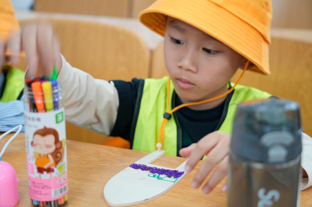 体验结束后,小朋友们迎来了一个充满创意与想象的绘画活动。他们每人领取了一艘空白的船模和彩色画笔。志愿者们鼓励小朋友们根据自己刚刚在模拟驾驶舱中的体验,以及在宣讲室学到的航海知识,画出自己心中理想的船舶。
