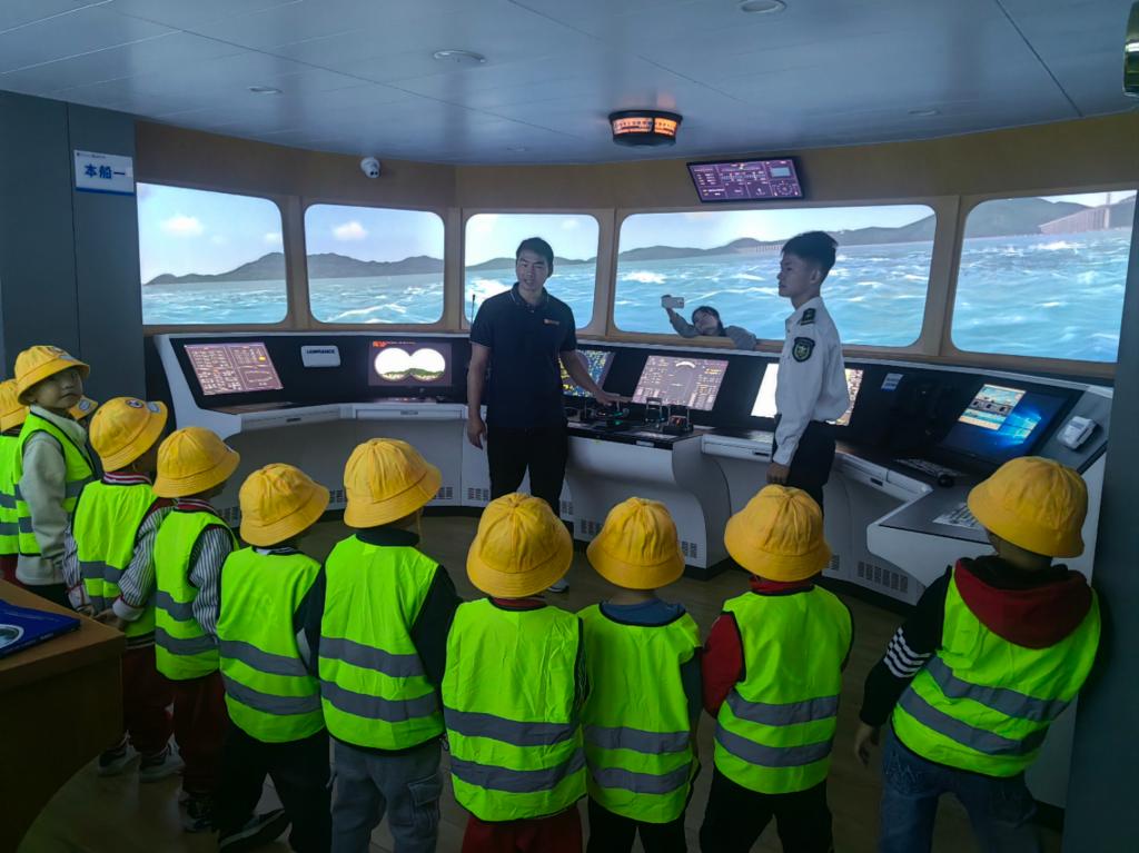 此次参观的重头戏是航海模拟器的体验环节。孩子们在志愿者的指导下,亲自操作航海模拟器,在虚拟的大海中乘风破浪,感受航海的刺激与乐趣。他们一个个兴奋不已,仿佛已经踏上了成为一名航海家的征程。